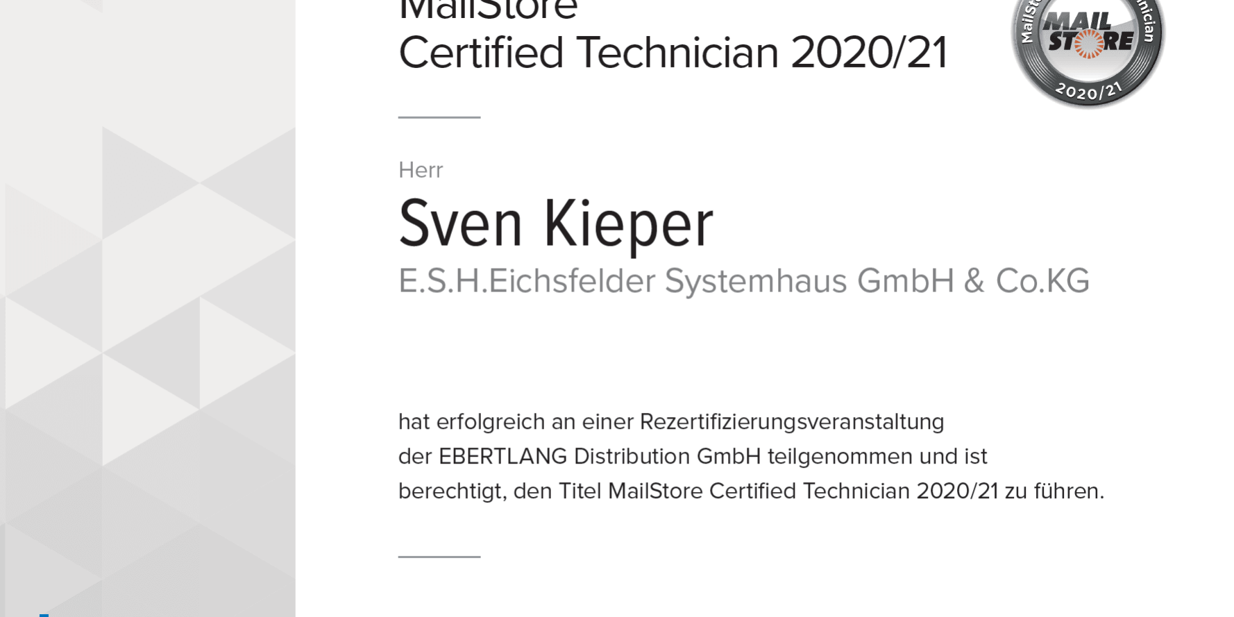 Eine erfolgreiche Zusammenarbeit verbindet uns mit dem Softwarehersteller MailStore, eine Spezialsoftware zur rechtssicheren Archivierung von E-Mail Nachrichten im Unternehmen. Zur bestmöglichen Betreuung unserer Kunden freuen wir uns mitteilen zu können, dass wir erneut erfolgreich die technische Zertifizierung für Mailstore absolvieren konnten. Damit steht auch Ihrem Unternehmen bei der Umsetzung der Mailarchivierung, gerade im Hinblick der Anforderungen der DSGVO, unser kompetentes Technikteam zur Seite.